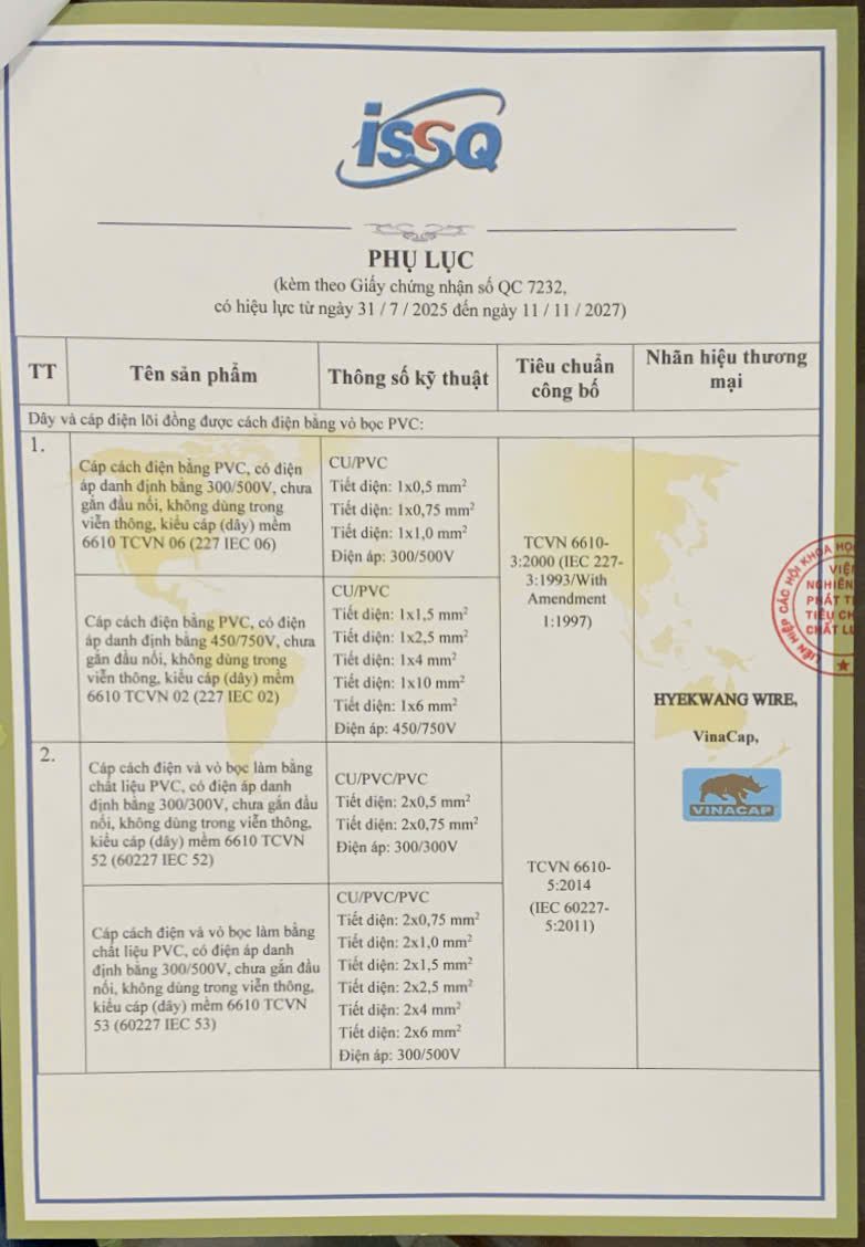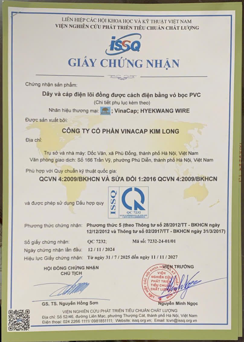 VINACAP KIM LONG cam kết và khẳng định sản phần HYEKWANG WIRE sản xuất tại CÔNG TY SMART CABLE CO., LTD (Korea) trước đây và sản phẩm HYEKWANG WIRE sản xuất tại Nhà máy của VINACAP KIM LONG (Việt Nam) có chất lượng như nhau.